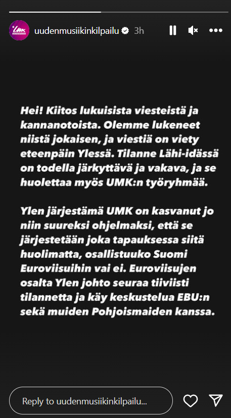 עמוד האינסטגרם הרשמי של קדם האירוויזיון הפיני "UMK", או בשמו המלא "Uuden Musiikin Kilpailu" התייחס לנושא מלחמת ישראל-חמאס בסטורי שהעלה לפני שעות אחדות, בו נכתב: "היי! תודה על ההודעות והדעות הרבות. קראנו כל אחת מהן, וההודעה הועברה ל-YLE (רשת הטלוויזיה הפינית). המצב במזרח התיכון ממש מזעזע וחמור וזה מדאיג גם את קבוצת העבודה של UMK. תחרות ה-UMK שאורגנה על ידי YLE כבר הפכה לתוכנית כל כך גדולה – שהיא תתקיים ללא קשר אם פינלנד תשתתף באירוויזיון או לא. בנוגע לאירוויזיון, הנהלת YLE עוקבת מקרוב אחר המצב ומקיימת דיונים עם איגוד השידור האירופי ומדינות נורדיות אחרות".