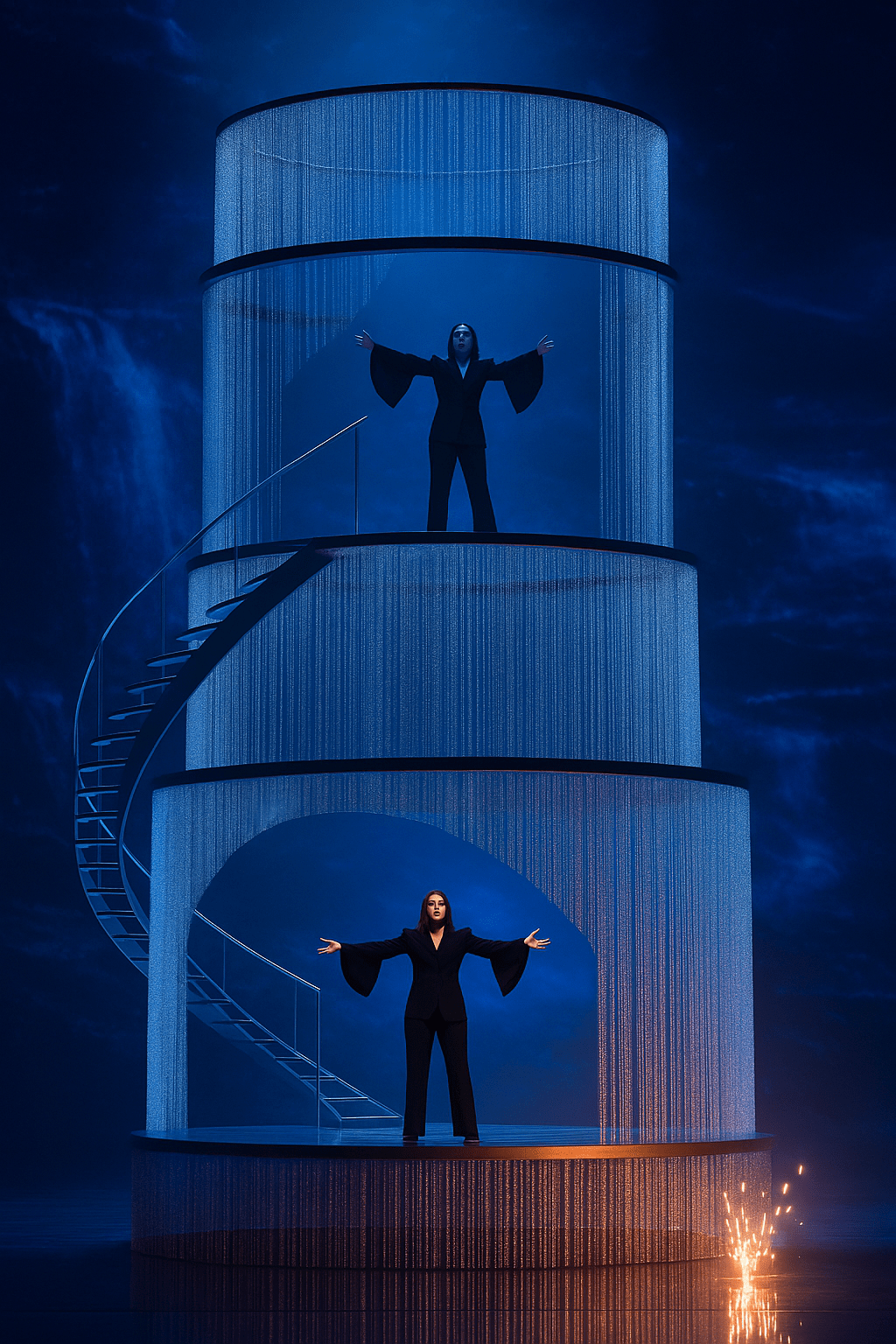 מה שמיד בולט – יש אביזר ענק במרכז הבמה, הגדול ביותר שראינו עד כה השנה. מדובר במבנה עגול דו-קומתי, בגובה של כחמישה מטרים, עם גרם מדרגות מעוגל בצד אחד. הקומה העליונה קטנה מעט מהתחתונה, ושני המעגלים עטופים בווילון נוצץ של חוטי כסף שמכסים אותם לחלוטין. דמיינו משהו בין כלוב ציפורים מודרני לנברשת שאפשר לטפס עליה – לא מדויק לגמרי, אבל זה יעזור לכם לדמיין עד שיצאו תמונות.